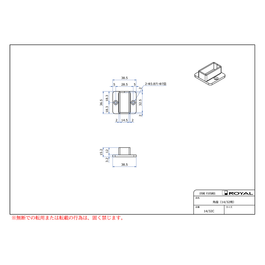 ●適合タッピング:市販軸径3mm 皿ビス穴径:φ7.0皿 φ3.8穴用