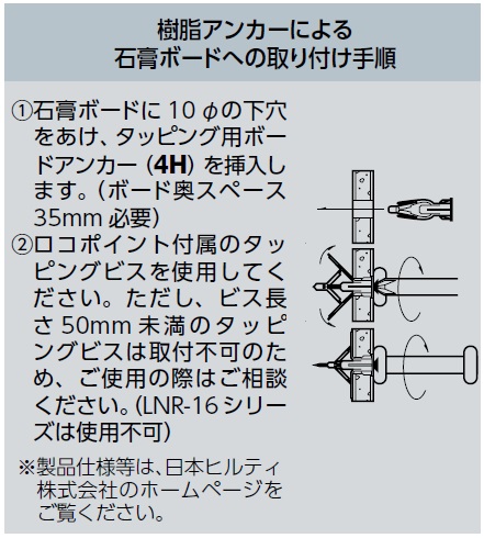 プロフィールhelp よくあるご質問 本体画像 ロコポイント取り付けパーツ ●石膏ボード専用 ●販売単位:10個単位でご注文ください。(表記価格は1個あたりの仕切価格になります) ●材質:樹脂 ●コンクリートにφ10の下穴をあけてください。 ●石膏ボードの厚み:12~16mm用になります。 ●環境負荷物質(SOC10)が非含有(基準値以下) menu_book カタログビューで見る 施工説明書 発注の手引き