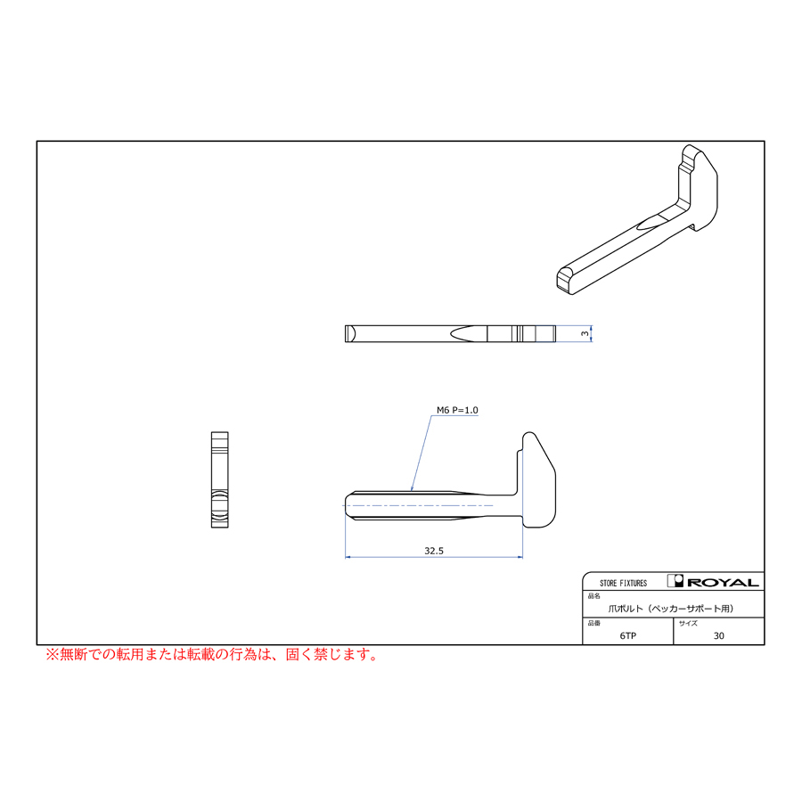 プロフィールhelp よくあるご質問 寸法図 ロコポイント取り付けパーツ ●NR-6取付不可 ●ペッカー専用 ●販売単位:10個単位でご注文ください。(表記価格は1個あたりの定価になります) ●材質:スチール ●厚みt=3.2mm ●ネジの呼び径:M6 ピッチ:1.0 ●環境負荷物質(SOC10)が非含有(基準値以下) menu_book カタログビューで見る 施工説明書 発注の手引き