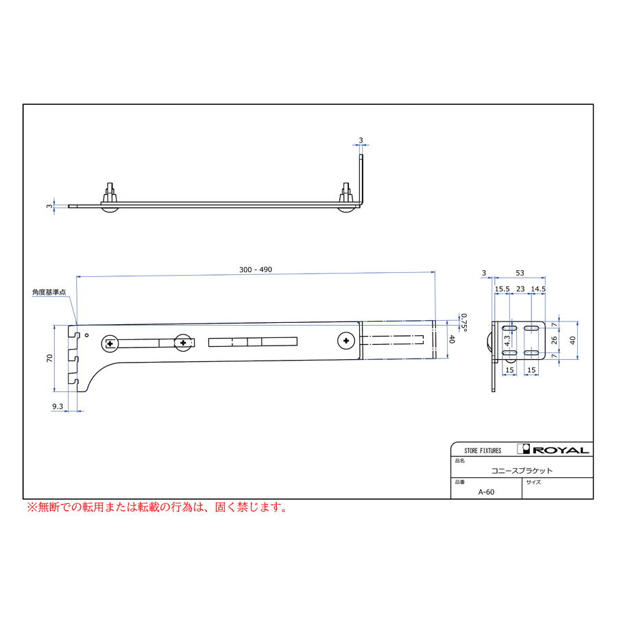 ●ブラケット装着時、無負荷状態では0.75°UPしております。(但し、t=2.0の棚柱のみ)