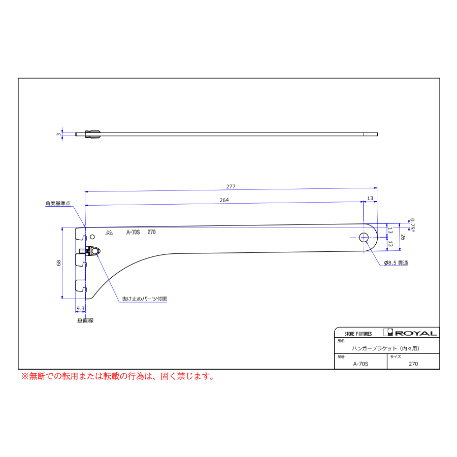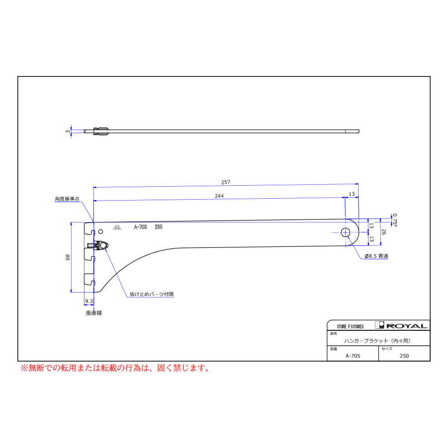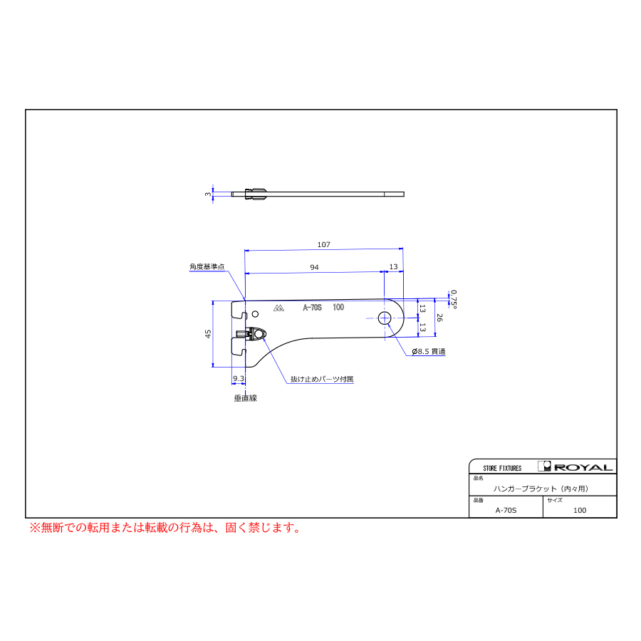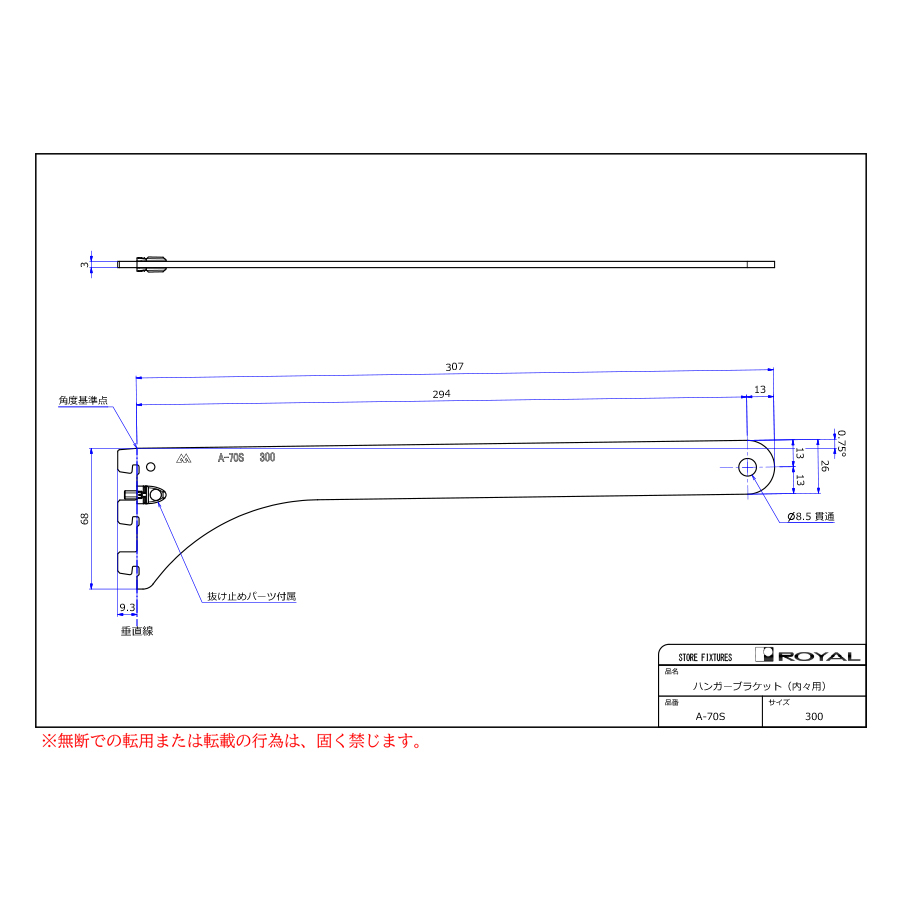 ●ブラケット装着時、無負荷状態では0.75°UPしております。(但し、t=2.0の棚柱のみ)