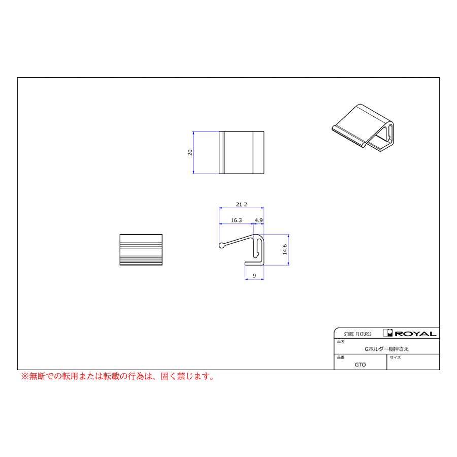 プロフィールhelp よくあるご質問 寸法図 ホルダー用傾斜ブラケット ●ガラス棚専用 ●フラット・10mm落とし込み兼用 ●対応ガラス厚:5~8mm ●材質:ポリカーポネート ●Gホルダーに取り付ける為、単体ではご使用できません。 ●環境負荷物質(SOC10)が非含有(基準値以下) menu_book カタログビューで見る 施工説明書 簡単取り付け!安全パーツ(GTO)