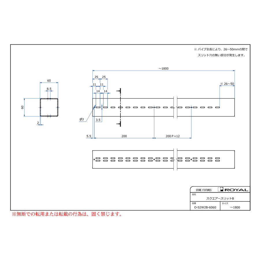 ご注文のパイプ全長により26~50mmの間でスリット穴の無い部分が発生します。