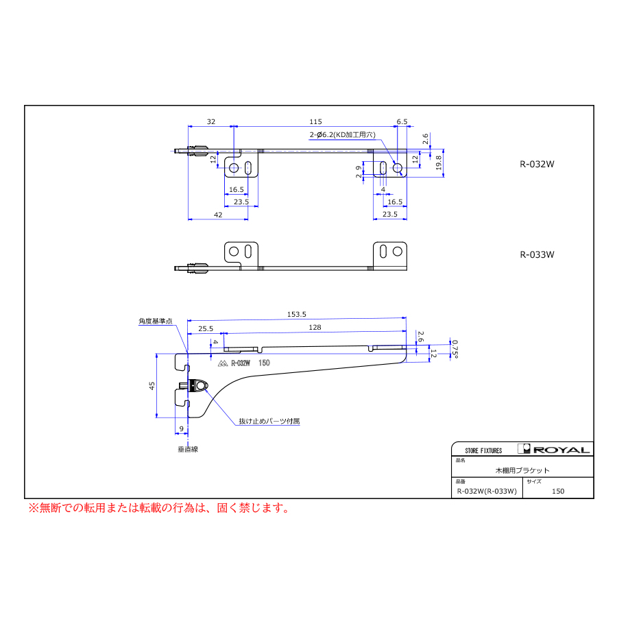 • ●ブラケット装着時、無負荷状態では0.75°UPしております。(但し、t=2.0の棚柱のみ)
