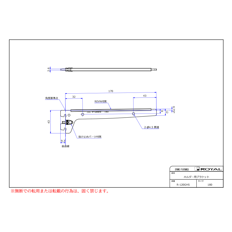 ●ブラケット装着時、無負荷状態では0.75°UPしております。(但し、t=2.0の棚柱のみ)