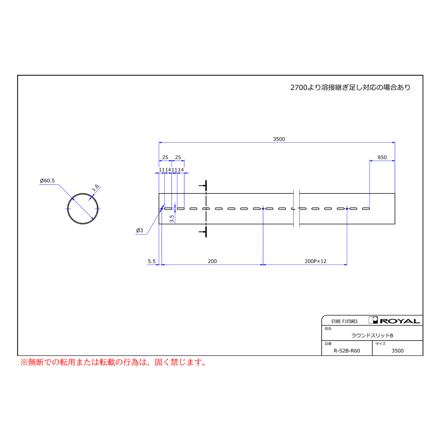 また、L=2650mm以下の場合は上下最後までスリット穴がございます。予めご了承ください。