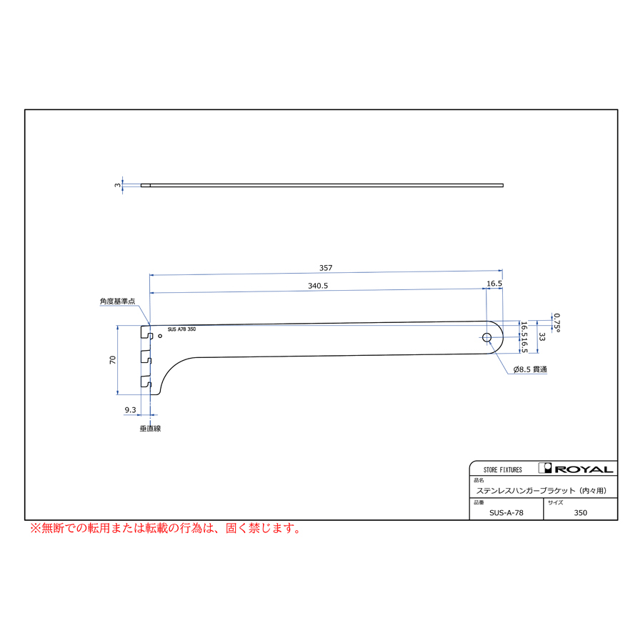 ●ブラケット装着時、無負荷状態では0.75°UPしております。(但し、t=2.0の棚柱のみ)