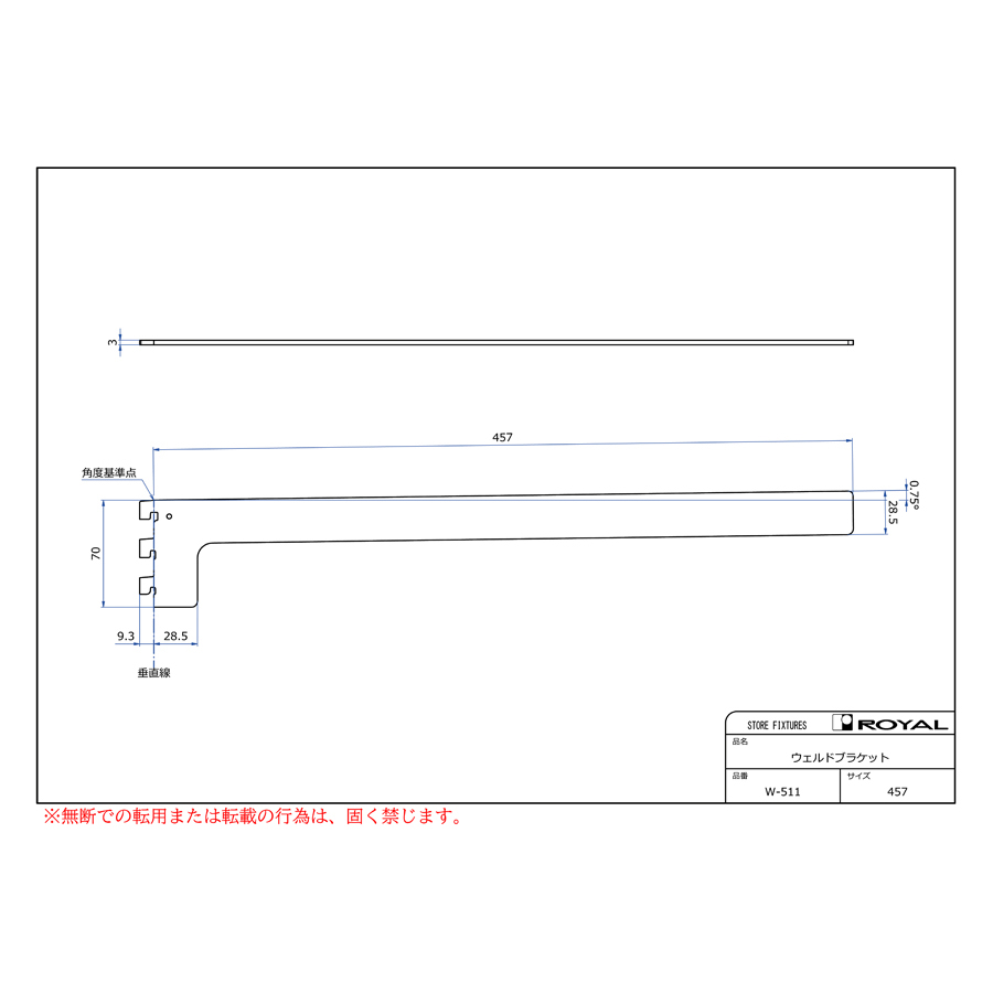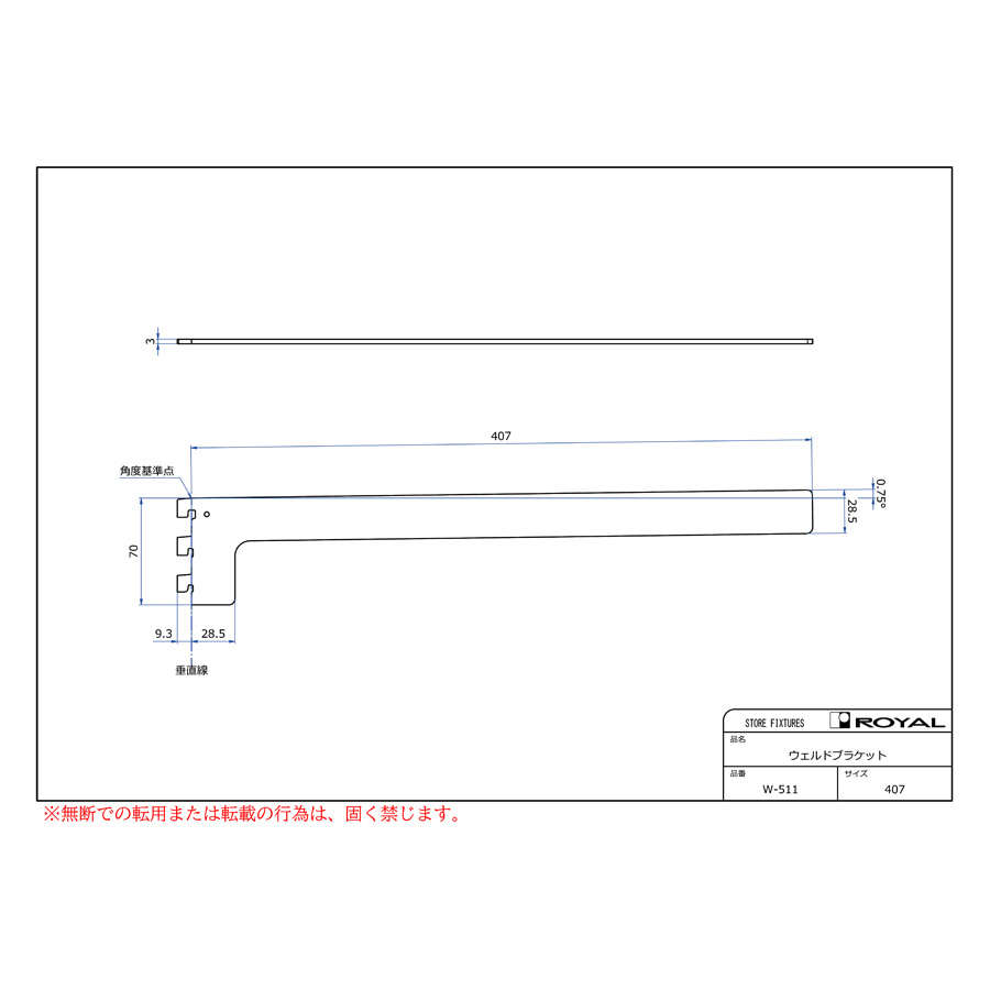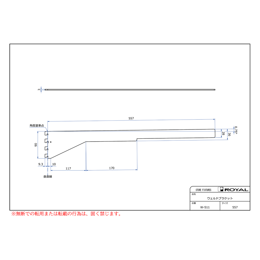 ●ブラケット装着時、無負荷状態では0.75°UPしております。(但し、t=2.0の棚柱のみ)