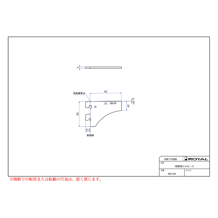 プロフィールhelp よくあるご質問 寸法図 ウェルドブラケット(弊社別注製作専用) ●ブラケット装着時、無負荷状態では0.75°UPしております。(但し、t=2.0の棚柱のみ) ●材質:スチール特殊鋼 ●厚みt=3.0mm ●ブラケットにLK・TPL(爪側PL)加工された製品と同時にRKYはご使用になれません。 ●生地に限り、環境負荷物質(SOC10)が非含有(基準値以下) menu_book カタログビューで見る