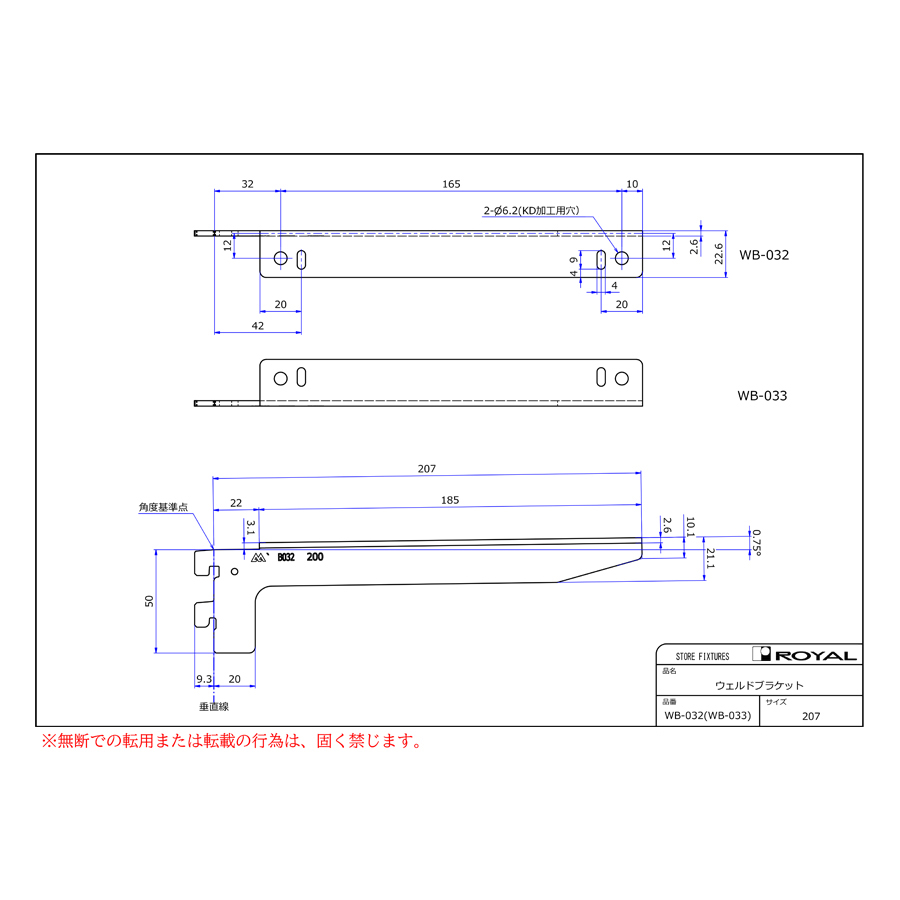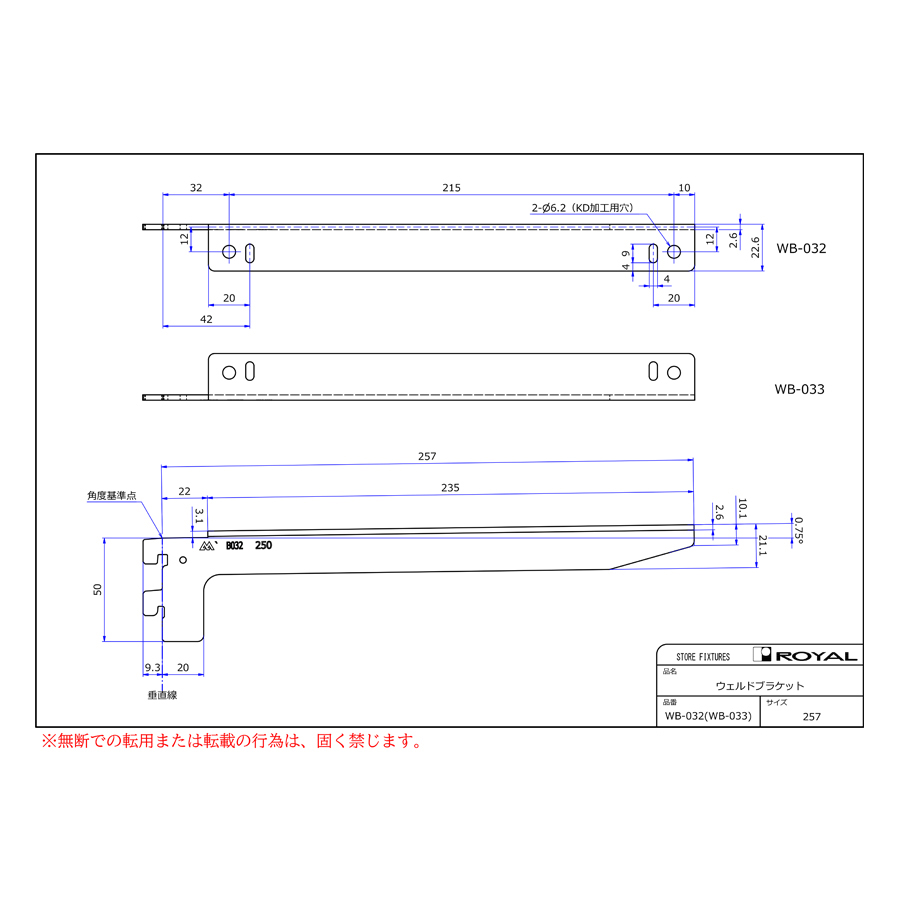 ●ブラケット装着時、無負荷状態では0.75°UPしております。(但し、t=2.0の棚柱のみ)