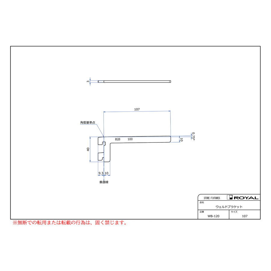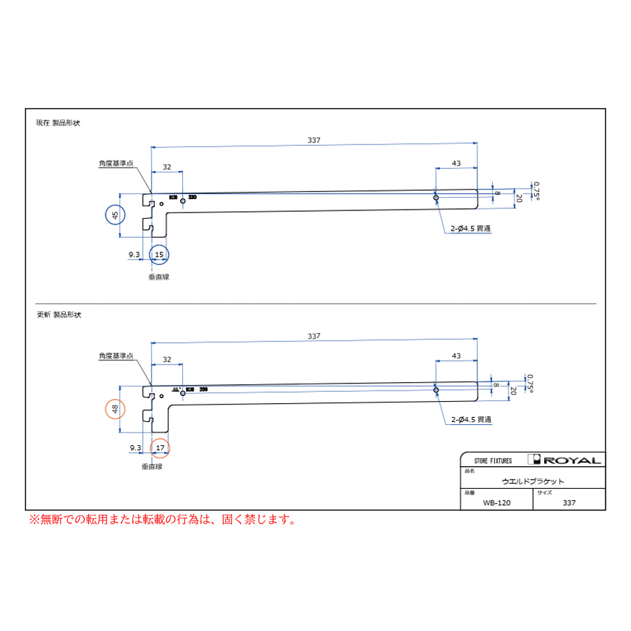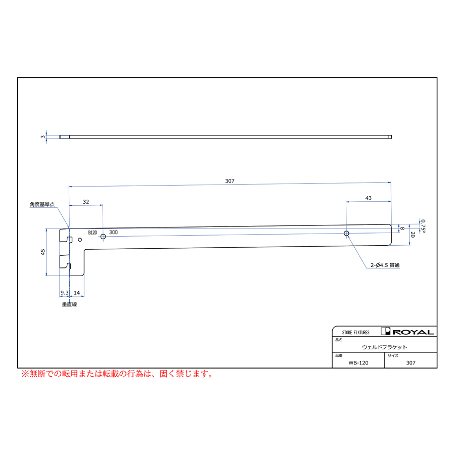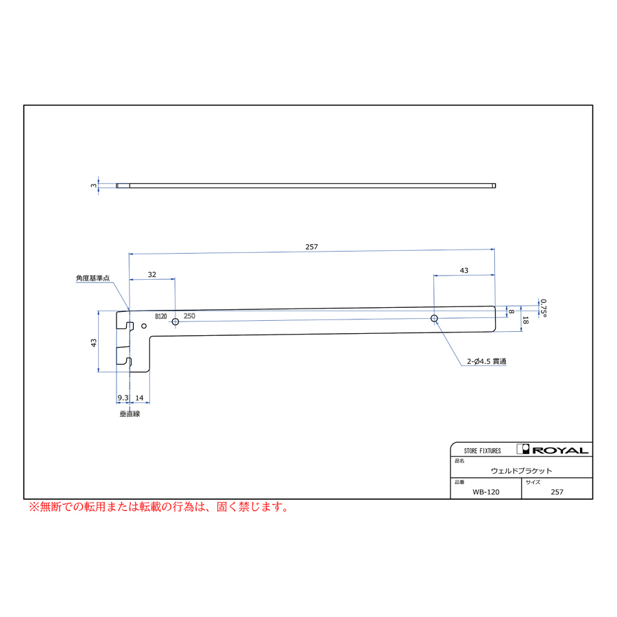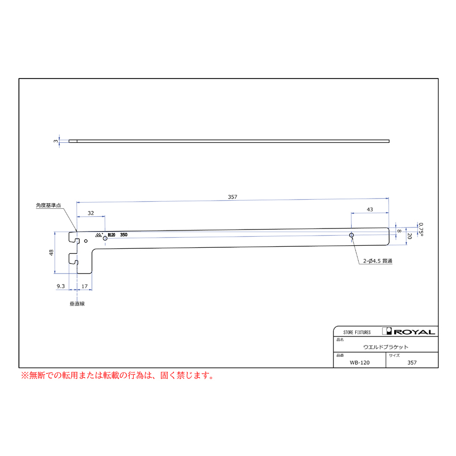 ●ブラケット装着時、無負荷状態では0.75°UPしております。(但し、t=2.0の棚柱のみ)