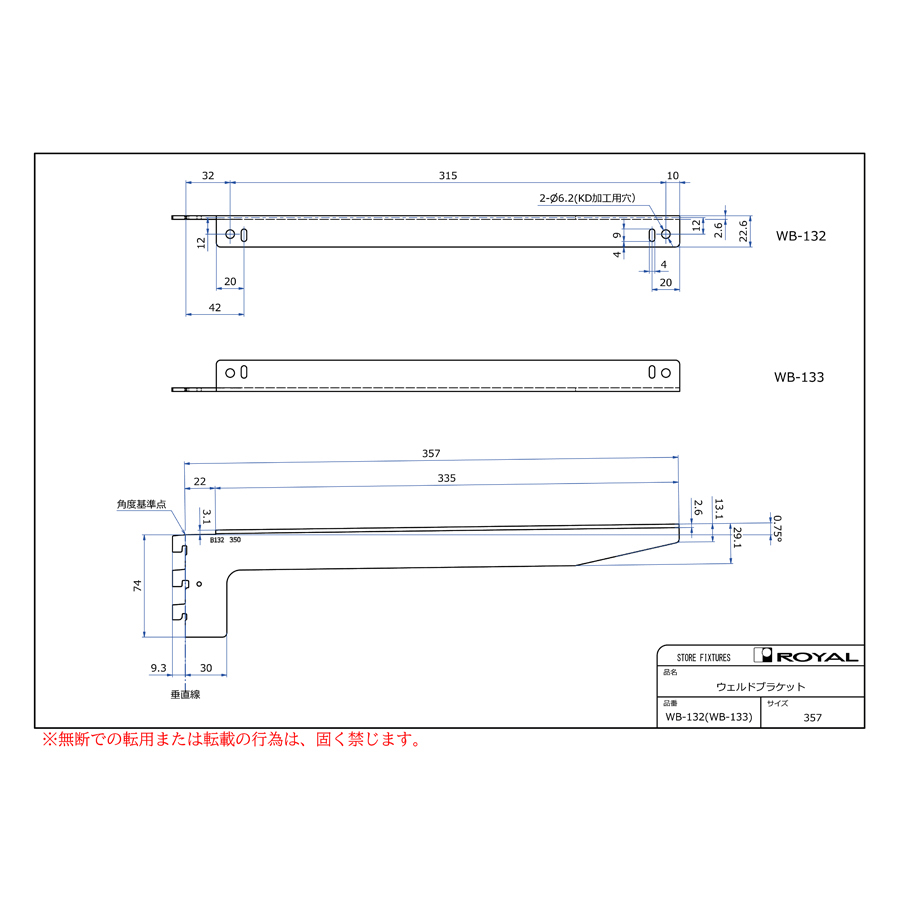 ●ブラケット装着時、無負荷状態では0.75°UPしております。(但し、t=2.0の棚柱のみ)