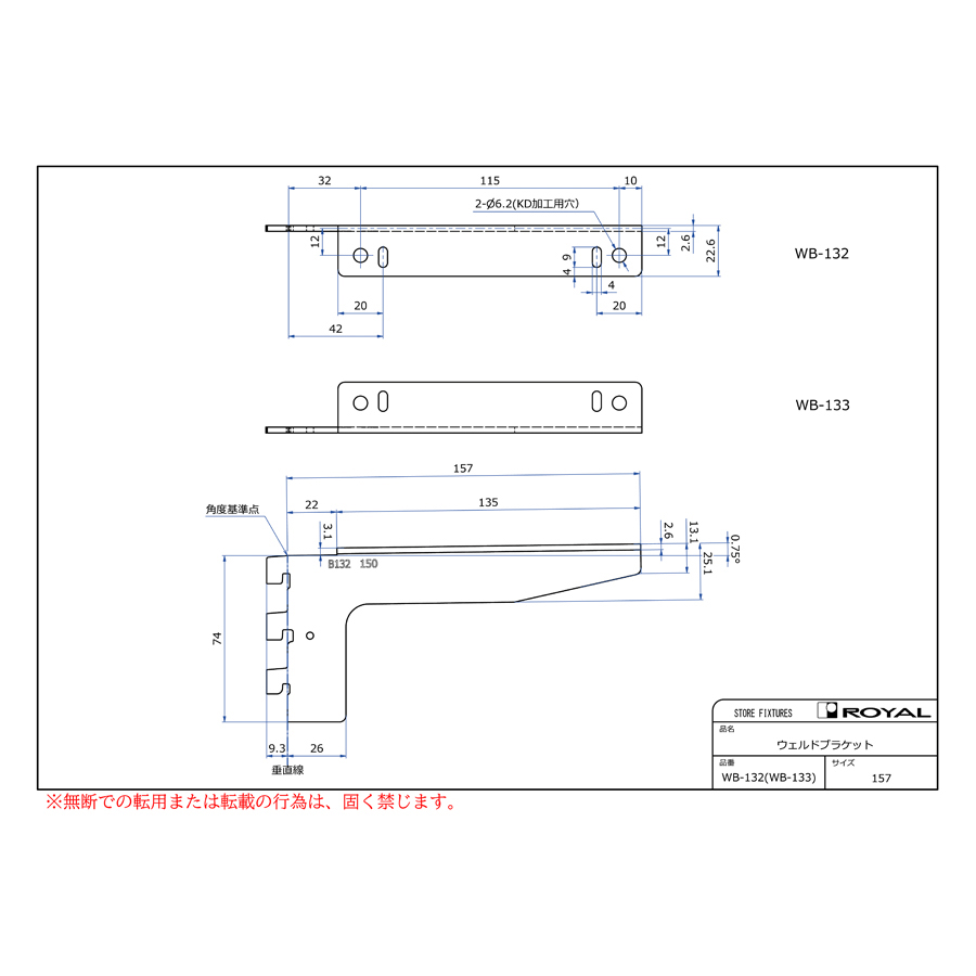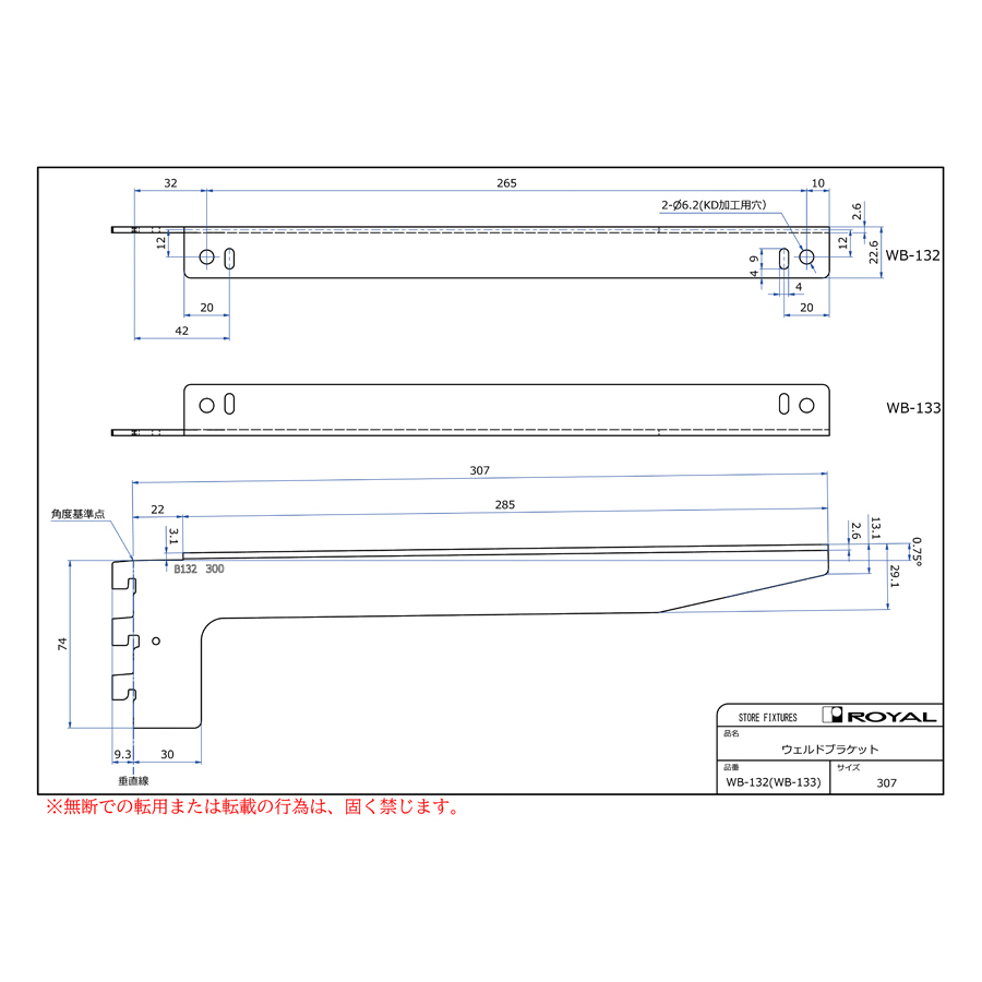 ●ブラケット装着時、無負荷状態では0.75°UPしております。(但し、t=2.0の棚柱のみ)